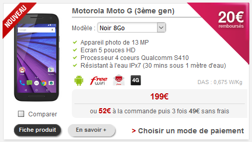 -  Pour tout achat d’un Moto G (3e génération), Motorola vous rembourse 20€. Cette offre de remboursement est valable jusqu’au 7 octobre 2015. Il est 4G cat.4 (jusqu’à 150 Mb/s en réception et 50 Mb/s en émission). La troisième génération du Moto G est proposée au tarif de 199€ (ou 179€ avec l’ODR). A noter, le flip cover n’est plus disponible. L’offre de remboursement est ici.