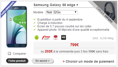 -  Dernier jour ! Pour tout achat d’un Samsung Galaxy S6 Edge+, un casque Level One (d’une valeur de 249€) est offert jusqu’au 03 septembre 2015, ainsi que 3 mois de musique en illimité (via Google Play Musique). Le S6 Edge+ est 4G cat.9 (jusqu’à 450 Mb/s en réception et 50 Mb/s en émission). Il est disponible au tarif de 799€. Rendez-vous ici pour télécharger le formulaire.