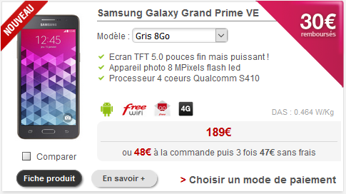 -   Jusqu’au 30 septembre 2015, Samsung vous rembourse 30€ pour tout achat d’un Samsung Galaxy Core Prime VE. Ce dernier est 4G cat.4 (jusqu’à 150 Mb/s en réception et 50 Mb/s en émission). Il est disponible au tarif de 189€ (contre 199€ avant la mise à jour de la boutique Free). Son prix final est donc de 159€ avec l’ODR. L’offre de remboursement est ici.
