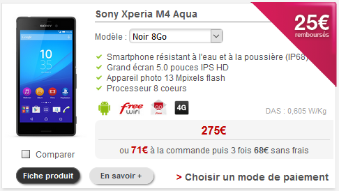 -  Nouveau : Jusqu’au 30 septembre 2015, pour tout achat d’un Sony Xperia M4 Aqua sur la boutique Free, Sony Mobile vous rembourse 25€. Il est 4G Cat.4 (jusqu’à 150 Mb/s en réception et 50 Mb/s en émission). Il est proposé au tarif de 275 € à la commande (soit 250€ avec l’ODR). L’offre de remboursement est ici.