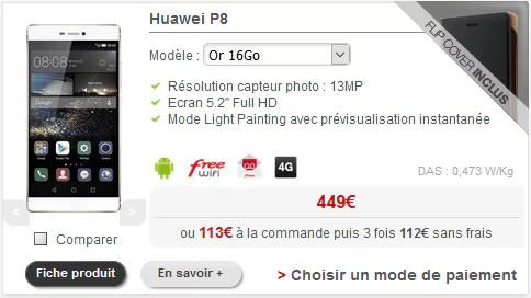 Nouveau : Du 2 au 16 septembre 2015, pour tout achat d’un Huaweï P8, un étui flip cover est offert. Ce smartphone haut de gamme est proposé en version 16 Go (Or ou Gris), au tarif de 449 € à la commande (contre 489€ auparavant). Il est 4G Cat.4 (jusqu’à 150 Mb/s en réception et 50 Mb/s en émission).