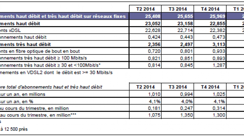 Au cours du deuxième trimestre 2015, le nombre d’abonnements au très haut débit (débit maximum descendant supérieur ou égal à 30 Mbit/s) a progressé de 280 000 pour atteindre 3,8 millions, soit 1,5 million d’abonnements supplémentaires en un an (+63%). Au sein de ce total, le nombre d’abonnements à très haut débit dont le débit est égal ou supérieur à 100 Mbit/s s’accroit de 150 000 en un trimestre, dont 100 000 abonnements en fibre optique de bout en bout supplémentaires, soit un total de 1,140 million abonnements FTTH fin juin 2015.