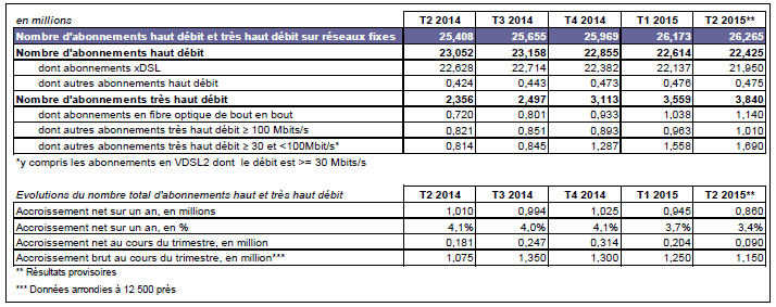 Au total, le nombre d’abonnements au haut et très haut débit fixes atteint 26,3 millions à la fin du deuxième trimestre 2015, en croissance de 90 000 en un trimestre et de 860 000 en un an (+3,4%).