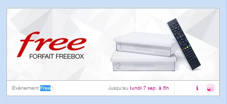 Alors qu’elle devait s’achever ce matin, la Vente Privée Free a été prolongée une nouvelle fois, jusqu’au 7 septembre 2015, à 6h. Celle-ci propose l’offre Freebox Crystal à 1.99€ euro par mois forfait pendant 1 an (au lieu de 31.98€/mois).