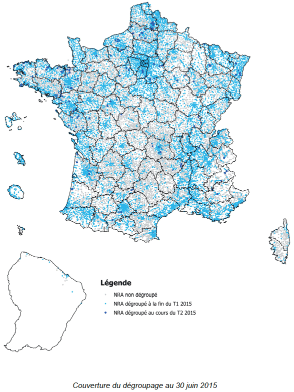 La totalité des 17 021 NRA (Nœuds de raccordement d’abonnés, sièges des répartiteurs) sont aujourd’hui équipés en DSL en métropole et dans les DOM, et 99,5 % des lignes en cuivre sont éligibles à un service haut débit. Ce calcul repose sur l’affaiblissement théorique des lignes et prend également en compte les lignes inéligibles au haut débit du fait des équipements de multiplexage.