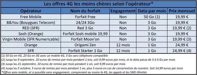 Le site du magazine Capital vient de publier un comparatif, qui prend cette fois-ci en compte le prix du forfait. Il compare ainsi le contenu des forfaits chez les différents opérateurs, qui proposent la 4G et les appels illimités. S’ils affichent presque tous un prix de 19,99€, ils sont loin d’être aussi généreux en data que celui de Free.