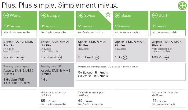 1. Plus Start 19CHF/mois (17.52€) ou 29CHF/mois (26.75€) avec mobile :