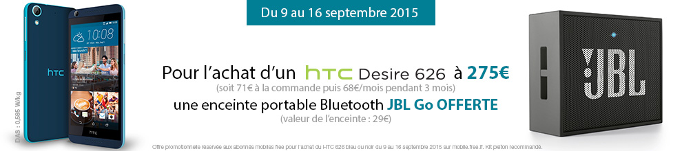 Le HTC Desire 626 (16Go en Bleu ou Noir) est proposé au tarif de 275€ ou 71€ à la commande puis 3 fois 68€. Par ailleurs, jusqu’au 16 septembre, une enceinte JBL Go est offerte.