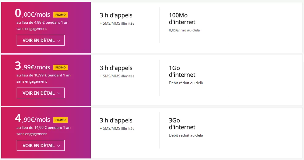 Ce forfait à 0 euro côtoie d’autres offres promotionnelles incluant également 3 heures d’appels :