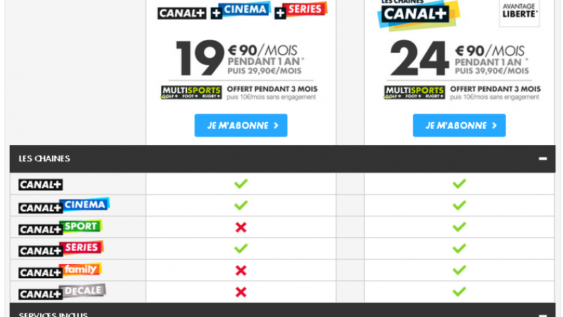 Canal+ vient de lancer de nouvelles offres promotionnelles disponibles via la Freebox. Deux formules sont proposées : soit 3 chaînes, pour ceux qui sont intéressés uniquement par les films et séries (Canal+, Canal+ Cinéma et Canal+ séries) ou la totalité des chaînes Canal+ (Canal+, Canal+ Cinéma, Canal+ series, Canal+ Décalé, Canal+ Sport et Canal+ family)