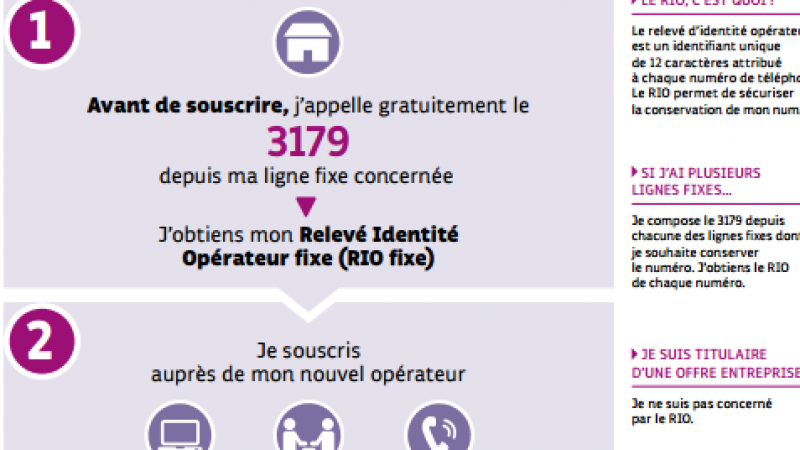 Ainsi que le rappelle l’ARCEP, à partir du 1er octobre, tous les opérateurs doivent mettre en place la portabilité des numéros fixes, en utilisant le numéro RIO. Pour le récupérer, l’abonné doit appeler le 3179 depuis sa ligne fixe (à son domicile) : N° Freebox ou éventuellement, N° France Télécom (Orange) si vous avez conservé ce numéro après le passage en dégroupage total. Il vous est alors donné le numéro RIO correspondant au numéro choisi.