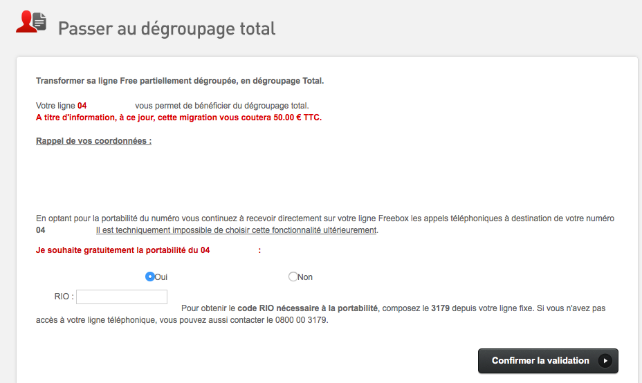 Depuis ce matin, cette procédure est déjà en place lorsqu’un abonné Freebox souhaite passer de dégroupage partiel à dégroupage total et conserver son numéro géographique France Télécom/Orange. Ce numéro RIO est également demandé en zone non dégroupés lors du passage de l’offre IP ADSL à l’offre Freebox Only. Dans les 2 cas cette procédure permet de ne plus payer l’abonnement téléphonique de 18€ à Orange.