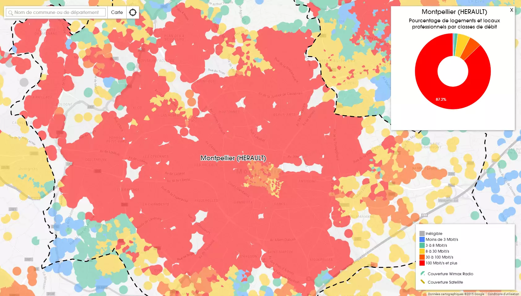 On peut voir sur cette première carte que la ville de Montpellier dispose en grande partie du très haut débit et que l’on se rapproche des 90% des logements et locaux professionnels pouvant y avoir accès.