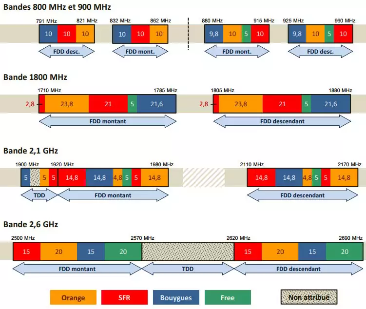 Comme on peut le constater de façon flagrante, c’est Free Mobile qui dispose de moins de fréquences. Cela est lié en parti au fait qu’il est arrivé beaucoup plus tard que les autres sur le marché et qu’il n’a donc pas bénéficié de fréquences 2G gratuites comme ses concurrents. Mais grâce au rééquilibrage des fréquences, il va récupérer au total 15 MHz dans la bande 1800.