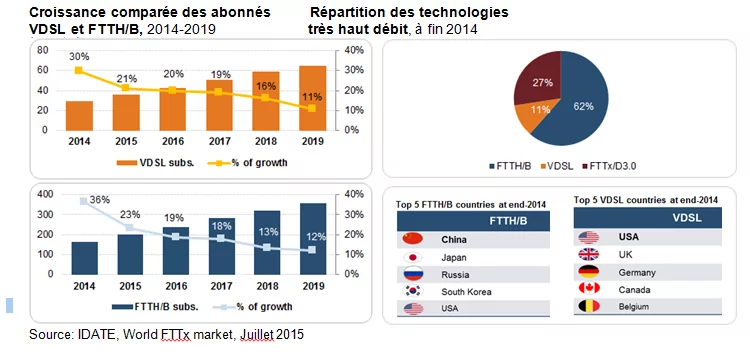 – FTTH/B représente 62% des abonnés FTTx à fin 2014. La croissance des abonnés FTTH/B restera très positive jusqu’en 2019, mais à un rythme moins soutenu que ce que nous avons connu en 2014, année exceptionnelle par les succès des déploiements en Chine.