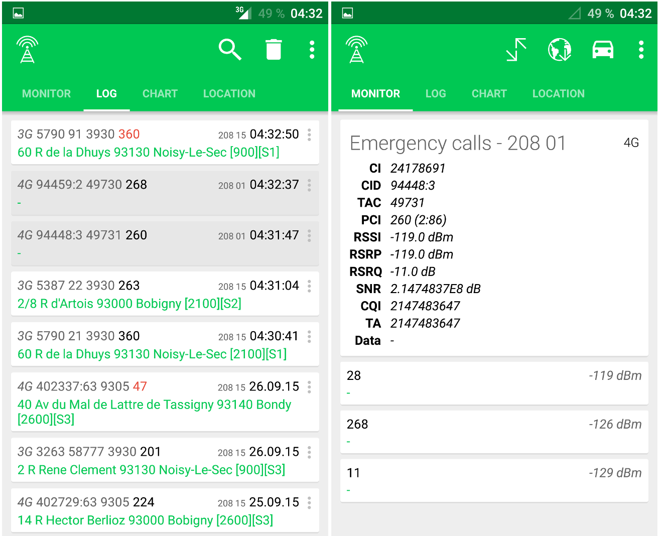 En consultant les logs de connexion, on peut se rendre compte que le smartphone tente, à plusieurs reprises, de se connecter sur le réseau 4G d’Orange alors qu’il n’est pas autorisé. Durant ces tentatives de connexion, le mobile est hors réseau. Dans l’exemple ci-dessous, le mobile « escalade » sur la 4G d’Orange (208 01) pendant près d’une minute (de 04:31:47 à 04:32:37 en Emergency calls ou Appels d’urgence seulement), avant de se connecter sur le réseau 3G de Free (208 15) à 04:32:50.