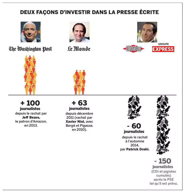 En une infographie, il est ainsi présenté l’évolution du nombre de salariés dans les différentes rédactions des titres de presse que possèdent Patrick Drahi, Xavier Niel et Jeff Bezos (qui a racheté le Washington Post).