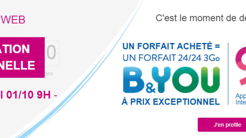 « Forfait B&You 24/24 3Go » pour 9,99 € par mois pendant 6 mois (au lieu de 19,99€ par mois). Celui-ci inclut les appels illimités, les SMS/MMS illimités et 3 Go de data en 3G/4G/4G+, débit réduit au delà (sans engagement).