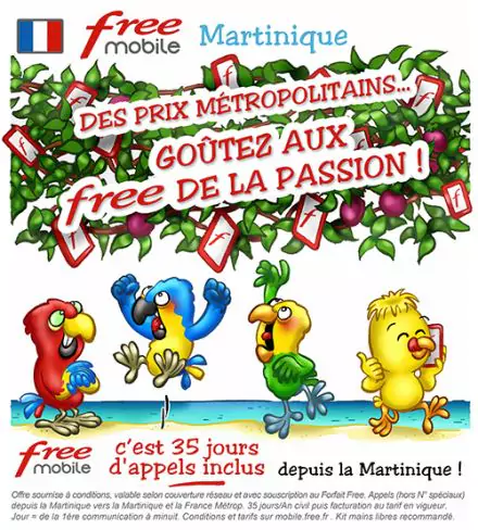 Si Free Mobile n’est pas directement présent à la Martinique, grâce au Pass destination, il est possible d’utiliser son forfait durant 35 jours par an, avec appels, SMS et MMS illimités et jusqu’à 3Go de data par mois sans surcoût. Et ce service proposé par Free fait parler jusque dans les forums martiniquais. C’est ainsi qu’un lecteur d’Univers Freebox nous a envoyé une image postée sur Zananas-Martinique avec pour slogan « Goûtez aux Free de la passion ». Il n’est cependant pas précisé où a été trouvée cette image et si c’est Free ou un Freenaute dessinateur qui l’a réalisée.