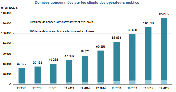 Avec le développement par les opérateurs mobiles d’offres incluant des services de données (navigation sur internet, télévision) et « le déploiement des réseaux de quatrième génération (4G), le trafic de données consommées par les clients, depuis leurs téléphones mobiles ou via les clés internet exclusives, connait une expansion très rapide », d’après le dernier observatoire des marchés des communications électronique au T2 2015. Sur chacun des cinq derniers trimestres ce trafic double en rythme annuel.