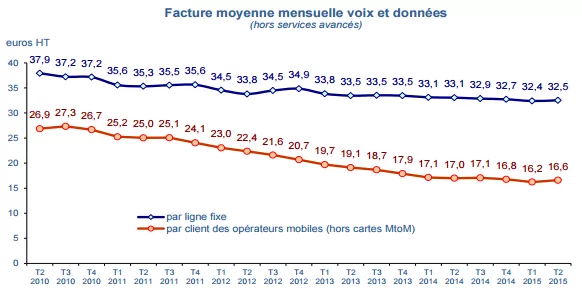 Sur le fixe : La facture mensuelle moyenne des services Haut et Très Haut Débit s’élève à 32,8€ HT (39.36€ TTC) par ligne fixe au deuxième trimestre 2015 (contre 32.7 € HT – 39.24€ TTC – au 1er trimestre 2015, soit une très légère progression par rapport à celle du trimestre précédent).