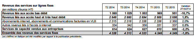 D’après l’observatoire des communications électroniques pour le 2e trimestre 2015, le revenu de l’ensemble des services fixes (y compris les services de capacité), identique à celui du trimestre précédent, s’élève à 4,2 milliards d’euros HT au deuxième trimestre 2015. Il est en repli continu depuis la fin de l’année 2010 en raison pour l’essentiel de la baisse du revenu lié aux accès bas débit (services de téléphonie sur le RTC, internet en bas débit, publiphonie et cartes téléphoniques).