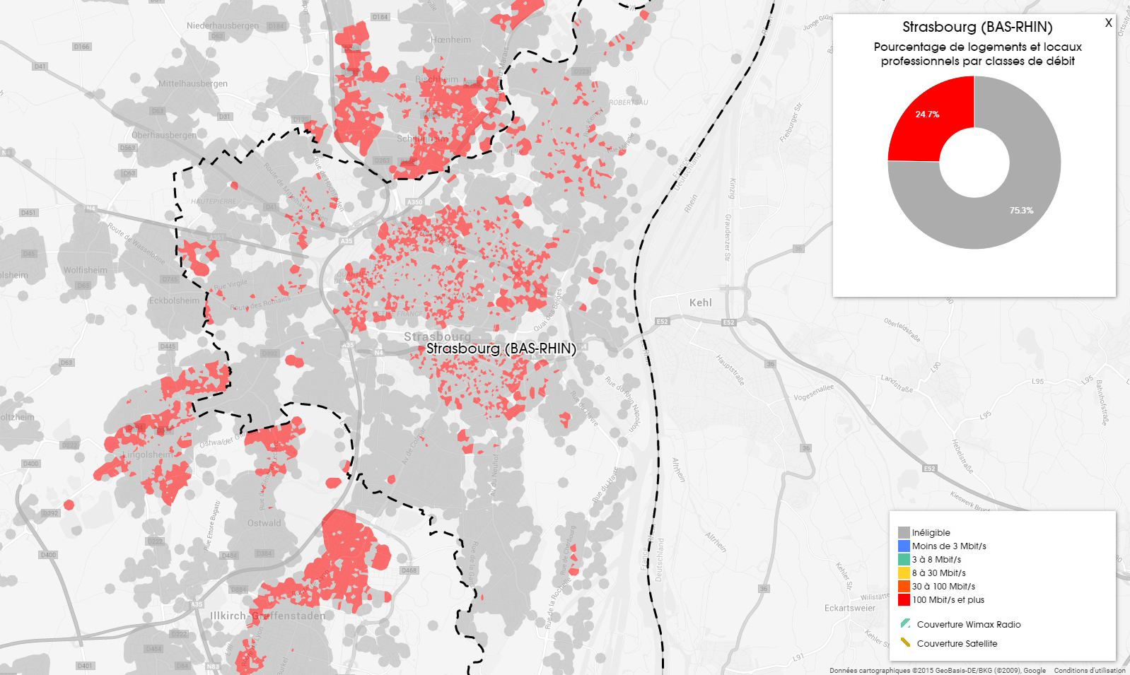Aujourd’hui, grâce aux données fournis par l’Observatoire France Très Haut Débit, nous vous proposons de découvrir le déploiement du très haut débit pour tous les opérateurs sur la 7ème ville la plus peuplées de France, Strasbourg.