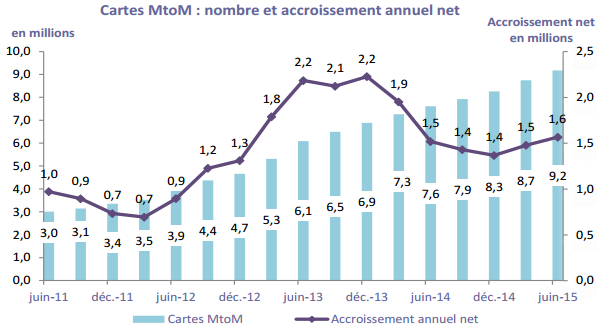 Le nombre de cartes SIM pour objets communicants (cartes « MtoM ») commercialisées actuellement essentiellement auprès de la clientèle professionnelle, atteint 9,2 millions au 30 juin 2015 (+20,6% sur un an), d’après l’Autorité de régulation des télécoms. Le rythme d’accroissement annuel du nombre de ces cartes est régulier sur les cinq derniers trimestres avec une progression d’environ +1,5 million chaque trimestre. Le revenu associé à ces cartes représente 24 millions d’euros sur le trimestre, d’après le dernier observatoire des marchés des communications électroniques au 2e trimestre 2015.