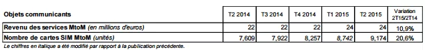 Le nombre de cartes SIM pour objets communicants (cartes « MtoM ») commercialisées actuellement essentiellement auprès de la clientèle professionnelle, atteint 9,2 millions au 30 juin 2015 (+20,6% sur un an), d’après l’Autorité de régulation des télécoms. Le rythme d’accroissement annuel du nombre de ces cartes est régulier sur les cinq derniers trimestres avec une progression d’environ +1,5 million chaque trimestre. Le revenu associé à ces cartes représente 24 millions d’euros sur le trimestre, d’après le dernier observatoire des marchés des communications électroniques au 2e trimestre 2015.