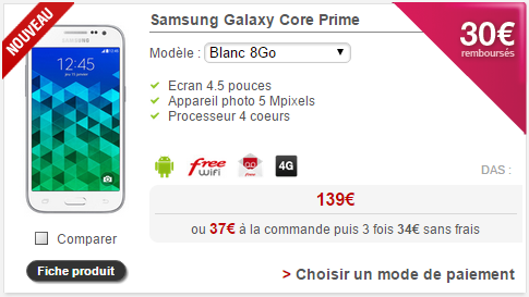 Idem pour le Core Prime. Jusqu’au 31 décembre 2015, Samsung vous rembourse 30€ pour tout achat d’un Samsung Galaxy Core Prime. Ce dernier est 4G cat.4 (jusqu’à 150 Mb/s en réception). Il est disponible au tarif de 139€ (soit 109€ avec l’ODR). L’offre de remboursement de Samsung est ici.