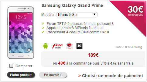 Jusqu’au 31 décembre 2015, Samsung vous rembourse 30€ pour tout achat d’un Samsung Galaxy Grand Prime. Ce dernier est 4G cat.4 (jusqu’à 150 Mb/s en réception). Il est disponible au tarif de 189€ (soit 159€ avec l’ODR). L’offre de remboursement de Samsung est ici.