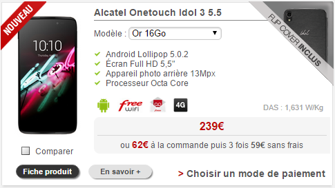 Jusqu’au 7 octobre, un flip cover est offert pour tout achat d’un Alcatel OneTouch IDOL 3 sur la boutique mobile de Free. Prêt pour la 4G (cat.4 jusqu’à 150 Mb/s en réception), l’IDOL 3 est disponible au tarif de 239€.