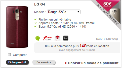 Nouveau : On continue ce petit tour d’ensemble avec le LG G4. Jusqu’au 28 novembre 2015, pour tout achat d’un G4, LG vous rembourse 50€. Le G4 est disponible au tarif de 589€, soit 539€ avec l’ODR. Pour l’offre de remboursement, rendez-vous ici. Par ailleurs, pour tout achat de ce smartphone haut de gamme, une coque dorée est incluse. Le LG G4 est 4G cat.6 (jusqu’à 300 Mb/s en réception). Il est également proposé dans le cadre de la location 24 mois de Free (89€ à la commande puis 14€/mois pendant 24 mois).
