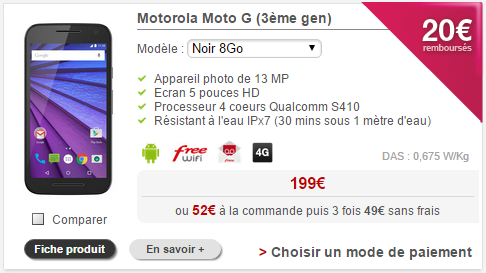 Jusqu’au 7 octobre 2015, pour tout achat d’un Moto G (3e génération), Motorola vous rembourse 20€. Le Moto G est 4G cat.4 (jusqu’à 150 Mb/s en réception). Il est disponible au tarif de 199€, soit 179€ avec l’ODR. Pour l’offre de remboursement de Motorala, rendez-vous ici.