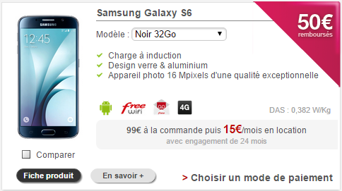 Une offre de remboursement est disponible pour les Galaxy S6. Samsung vous rembourse 50€ pour l’achat, ou même la location, d’un Galaxy S6 jusqu’au 18 octobre 2015. Avec cette ODR, le tarif du Galaxy S6 passe donc de 589€ à 539€. Le formulaire de remboursement pour le Galaxy S6 est ici.
