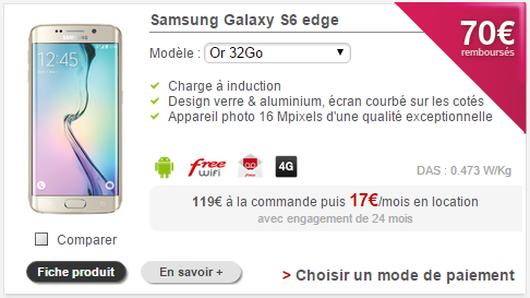 Idem pour le Samsung Galaxy S6 Edge. L’offre de remboursement est plus importante puisqu’elle propose 70€ de réduction. Le S6 Edge passe ainsi de 689€ à 619€. Le formulaire de remboursement pour le Galaxy S6 Edge est ici.