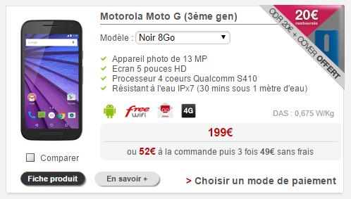 -  Nouveau : Pour tout achat d’un Moto G (3e génération), une coque supplémentaire est offerte jusqu’au 31 octobre 2015. Le Moto G est compatible 4G cat.4 (jusqu’à 150 b/s en réception). Aussi, jusqu’au 31 décembre 2015, pour tout achat d’un Moto G (3e génération), Motorola vous rembourse 20€. Le Moto G est disponible au tarif de 199€, soit 179€ avec l’ODR. Pour l’offre de remboursement, rendez-vous ici.