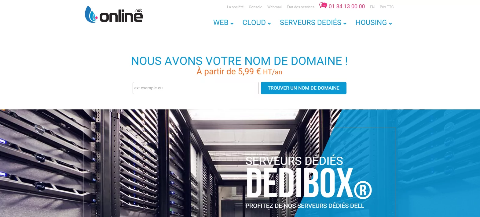 Online a dévoilé son nouveau site internet. Ce dernier regroupe l’ensemble des offres de la filiale d’hébergement du groupe Iliad. La barre supérieure permet d’accéder à toutes les offres dédiées. Nom de domaine, hébergement Web ou Cloud, serveurs dédiés, espace dédié à l’assistance, ou encore l’accès réservé aux abonnés.