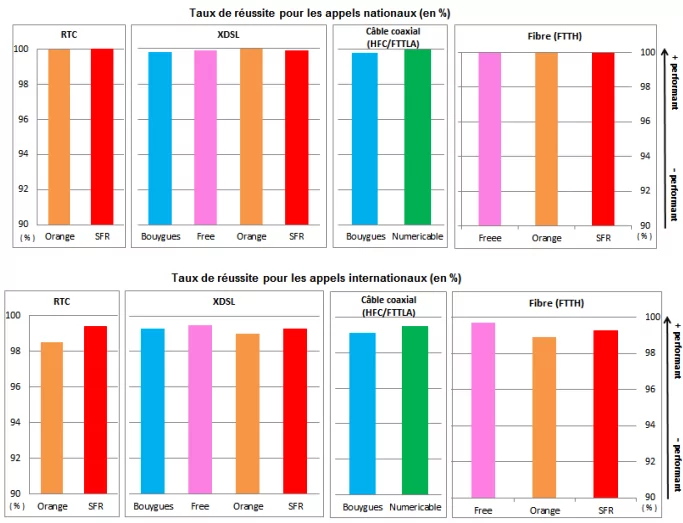 Cet indicateur traduit la probabilité pour un appelant de voir son appel aboutir, et donc de ne pas avoir d’appel défaillant. Un appel défaillant est un appel dont le résultat n’est pas conforme à ce qui est attendu soit parce qu’il n’aboutit pas, soit parce que la communication est interrompue avant la durée prévue. Cela peut se traduire notamment par un temps de décroché anormalement long (>35s), l’accès à un message d’erreur, une indisponibilité de tonalité, une interruption de communication.