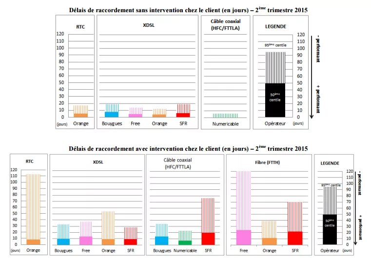 L’histogramme plein représente le 50ème centile des délais de raccordement, c’est-à-dire le délai en deçà duquel sont activés 50% des raccordements les plus rapides. L’histogramme hachuré représente le 95ème centile des délais de raccordement, c’est-à-dire le délai en deçà duquel sont activés 95% des raccordements les plus rapides.