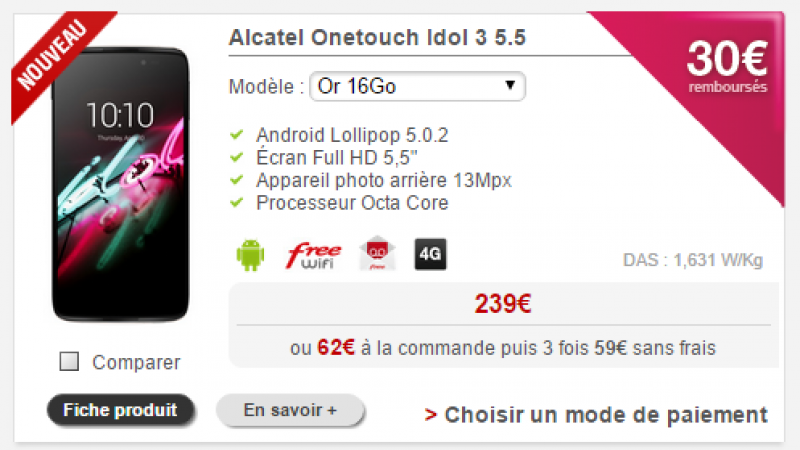 L’Alcatel OneTouch IDOL 3 est proposé au tarif de 239€, soit un prix final de 209€ avec l’ODR.