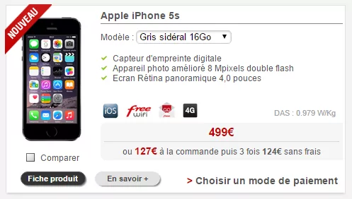 Un nouveau smartphone est disponible sur la boutique Free Mobile. Enfin, nouveau pas vraiment, puisqu’il s’agit de l’iPhone 5s (4G cat.3, soit 100 Mb/s en réception et 50 Mb/s en émission). Ce dernier est disponible en version 16 Go (Gris sidéral ou Argent) au tarif de 499€ à la commande ou en paiement 4x sans frais (127€ à la commande puis 124€/mois pendant 3 mois).