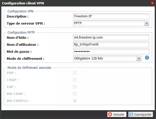 Dans l’onglet "Configuration VPN" puis dans "Ajouter une connexion" il faudra choisir un nom au client et le type de serveur VPN (PPTP ou openVPN), puis dans la partie configuration, les paramètres de connexion de votre VPN.