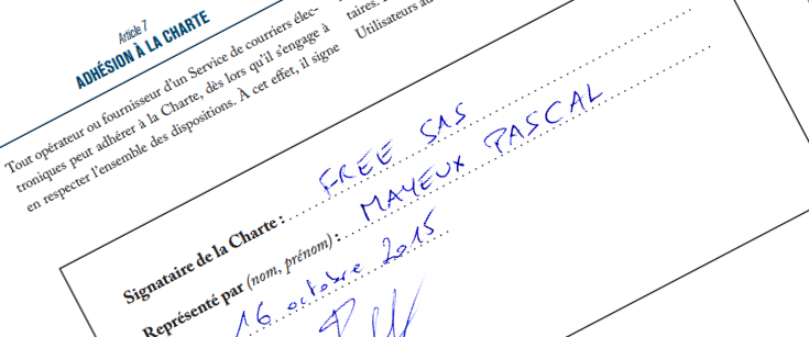 Free, représenté par Mayeux Pascal, a signé la « charte pour la sécurité des services de courriers électroniques », élaborée dans le cadre d’une coopération entre l’agence nationale de la sécurité des systèmes d’information (ANSSI) et des fournisseurs de services de courriers électroniques.