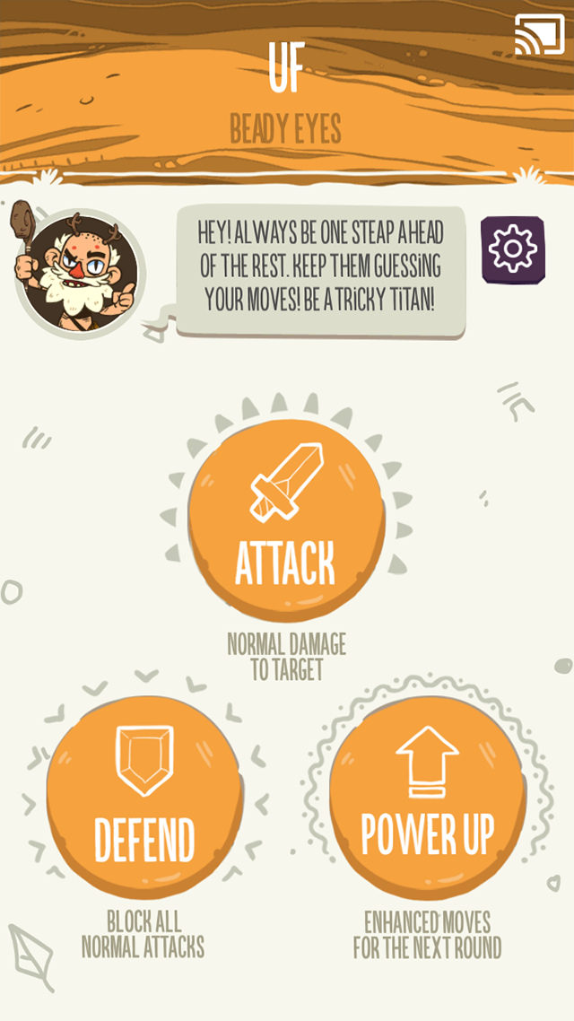 Le principe de base du jeu est très simple, seul une action est possible par tour parmi un choix de 3 actions. Vous pourrez donc attaquer, vous défendre ou vous améliorer. Attaquer fera descendre la vie du titan adverse sélectionné, se défendre permet de résister aux attaques des titans adverses et le Power Up permettra d’augmenter sa puissance pour le prochain tour et de passer outre les défenses ennemies.