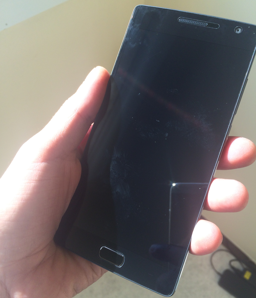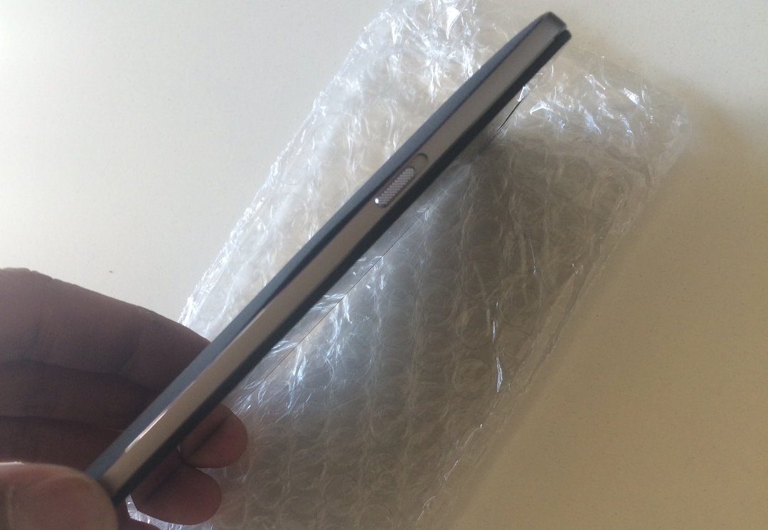 Le cadre extérieur du OnePlus 2 est fabriqué dans un alliage ultra-résistant d’aluminium et de magnésium. Le design assure une réception parfaite par antenne et une excellente régulation de la température, augmentant ainsi ses performances. Sur l’avant de l’appareil, aucun logo. Quand l’appareil n’est pas utilisé, les touches de navigation s’estompent, puis disparaissent derrière une vitre en verre noir aux lignes pures. Attention aux traces de doigts néanmoins :