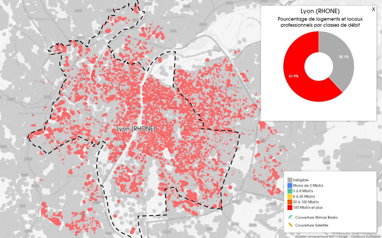 Aujourd’hui, grâce aux données fournis par l’Observatoire France Très Haut Débit, nous vous proposons de découvrir le déploiement du très haut débit pour tous les opérateurs sur la 3ème ville la plus peuplée de France, Lyon.
