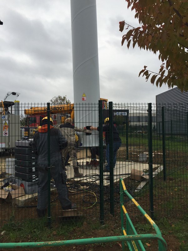 Les techniciens ajustent le pylône sur les nombreuses fixations prévues au sol. Ensuite, il faut serrer bien fort ! On peut voir les modules en premier plan.