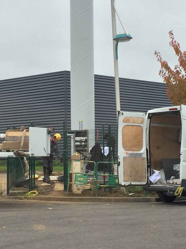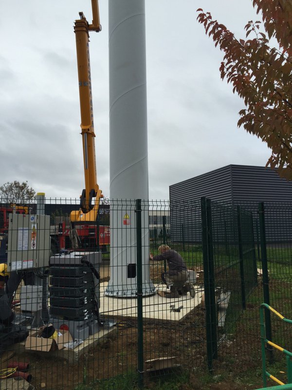 Ci-dessous, les techniciens vérifient que l’installation est bien droite, puis coule une dalle de béton supplémentaire pour assurer le maintien.
