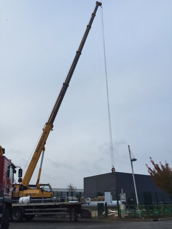 Les camions-grues entrent en scène. Ils sont bien évidemment indispensables pour les techniciens sur place :